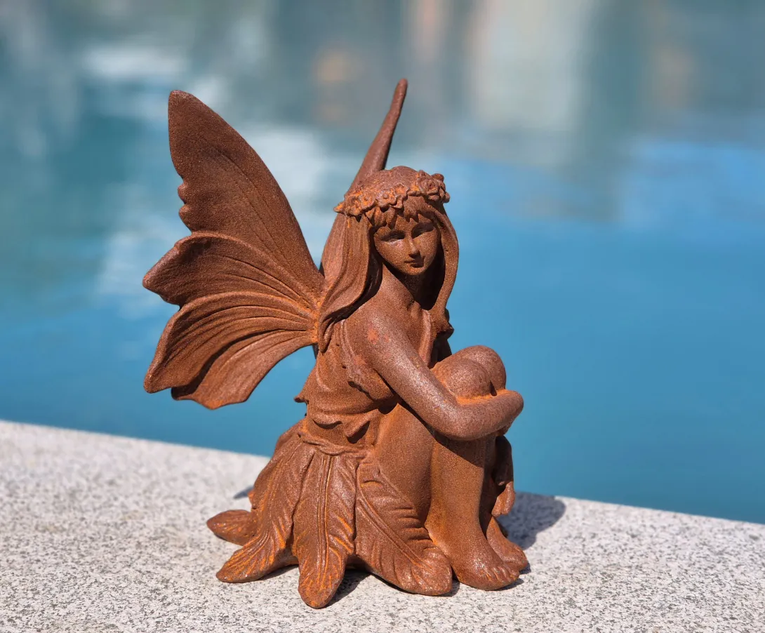Wunderschöne Elfe "Sitzend" aus Gusseisen. Ein besonderes Highlight für Ihren Garten, mit einer perfekten Rostpatina.