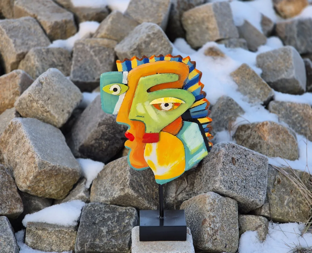 Metall Skulptur "Vista Doppio" bunt. Holen sie sich ein spezielles Deko Objekt zu sich nachhause. Auf schwarzer Basis 14x11 Filzboden.