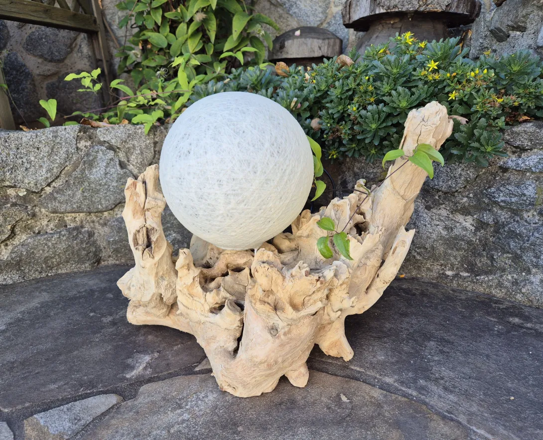 Die runde Kugel wurde aus hellen Bast-Fäden gewickelt. Das Leuchtmittel ist im Lieferumfang enthalten. Die hier abgebildete Lampe ist auf Lager.